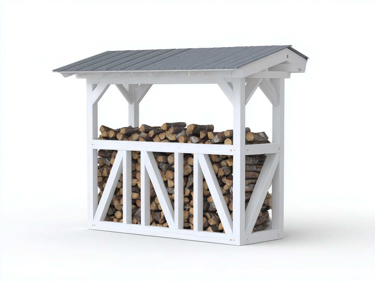 La estructura está fabricada en madera resistente con acabado en color blanco que aporta estabilidad y un aspecto limpio para el entorno exterior. El techo superior está elaborado con panel metálico en color gris que contribuye a proteger la leña frente a la humedad directa. La construcción robusta está pensada para un uso prolongado en exteriores.