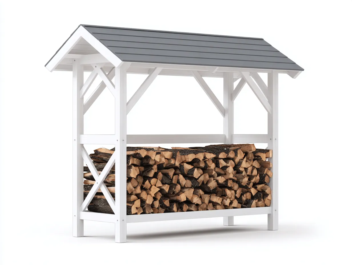 La estructura está fabricada en madera con acabado en color blanco que proporciona estabilidad y resistencia para uso en exteriores. El techo está diseñado con paneles en color gris que ayudan a desviar el agua y mejorar la protección de la leña almacenada. Los refuerzos laterales contribuyen a una mayor estabilidad estructural.