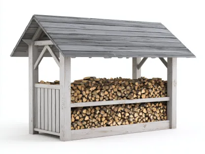 La estructura está fabricada en madera con acabado en color blanco que aporta estabilidad y resistencia para uso exterior. El techo está compuesto por paneles de madera en color gris que contribuyen a proteger la leña frente a la lluvia. La construcción abierta permite la ventilación natural del interior.