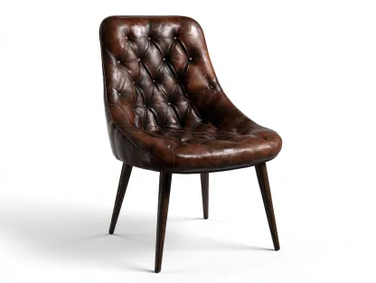 El asiento y el respaldo están tapizados en cuero sintético de color marrón con acabado capitoné que aporta textura y carácter visual. La base está compuesta por patas de madera resistente que proporcionan estabilidad y un aspecto natural. Los materiales han sido seleccionados para ofrecer durabilidad y un uso adecuado en el entorno doméstico.