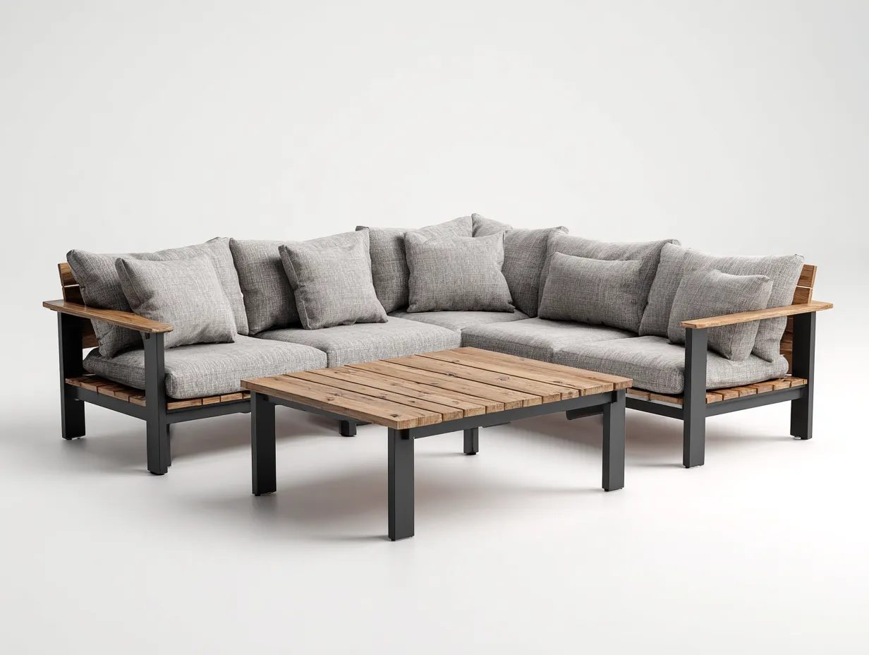 La estructura está fabricada con marco metálico resistente combinado con superficies de madera en tono natural que aportan estabilidad y durabilidad. Los cojines están tapizados en tela en color gris y cuentan con acolchado que proporciona comodidad durante el uso. La mesa incluye tablero de madera que combina visualmente con el resto del conjunto.